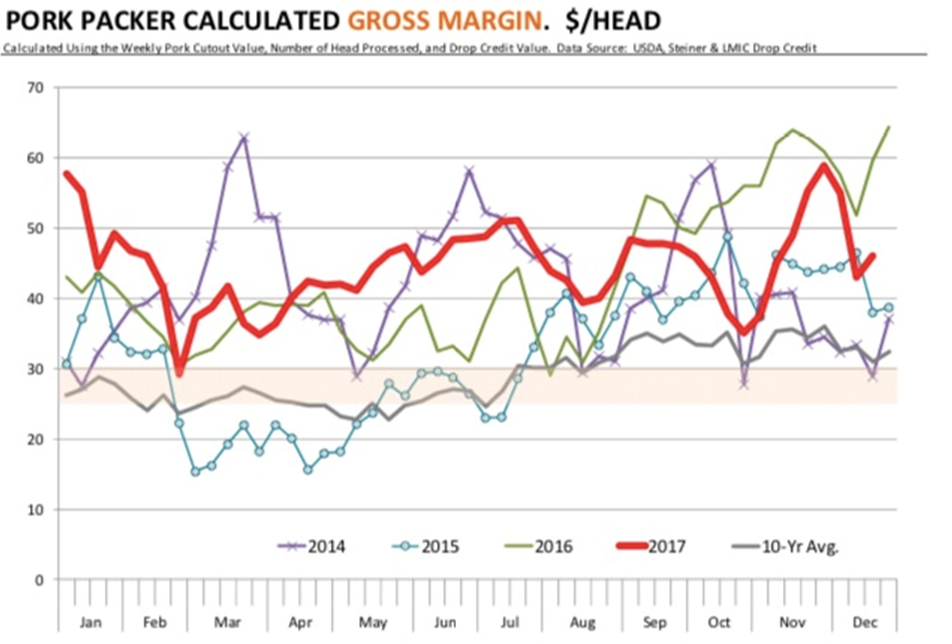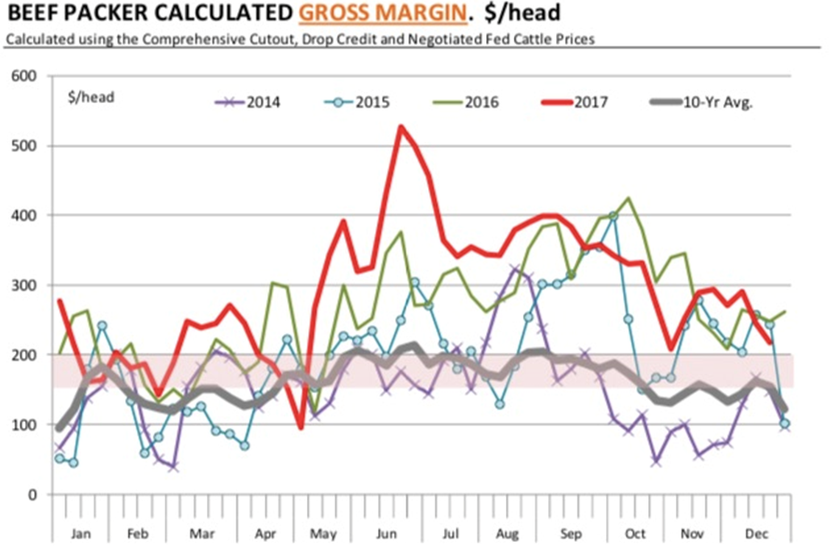 下附兩張圖表描繪了貿(mào)易商在開年的利潤率的不同情況。牛肉貿(mào)易商的利潤率在很大程度上被壓縮到今年年初,部分原因是寒冷的天氣對(duì)牛群的影響。在2017年,牛肉貿(mào)易商的利潤率非常好,對(duì)2018年的利潤率也仍然保持十分穩(wěn)健的預(yù)期。但是通常一季度的利潤都很低,今年也不會(huì)是個(gè)例外。當(dāng)所有牛肉需求呈良好態(tài)勢,牛供應(yīng)將持續(xù)增加,也會(huì)驅(qū)動(dòng)對(duì)牛肉分銷服務(wù)的需求。在最近兩周牛肉貿(mào)易商的利潤率被擠壓,我們認(rèn)為2017的最后一周的利潤率非常接近于盈虧平衡點(diǎn)。如果精選級(jí)牛部位肉價(jià)格保持在205美元這個(gè)范圍,貿(mào)易商會(huì)支付120美元去買牛,剩下的也就接近盈虧平衡,而沒有賺到一點(diǎn)錢。生豬貿(mào)易商在開年的利潤率通常都很高。假期縮短的周數(shù)往往使生豬利潤率延遲,在開年會(huì)有一個(gè)很大的需求,而這個(gè)需求伴隨著市場積壓庫存的清空。寒冷的天氣并沒有對(duì)生豬造成多大損失, 因?yàn)槎急灰浦糜谑覂?nèi)喂養(yǎng),牛的情況也是如此。在產(chǎn)品方面,貿(mào)易商也非常頭疼節(jié)后后腿需求的暴跌。在這種情況下,生產(chǎn)商會(huì)為了保持生豬的流通運(yùn)轉(zhuǎn)而提供給貿(mào)易商一個(gè)足夠大的利潤空間。這個(gè)庫存積壓的問題往往能被相當(dāng)快的解決。在1月的下半月我們應(yīng)該會(huì)看到一個(gè)更加正常的市場狀態(tài)。接下來的挑戰(zhàn)是豬肉在國內(nèi)和國外渠道中的需求。期貨市場現(xiàn)在的價(jià)格走勢呈現(xiàn)出了在這個(gè)冬季和早春對(duì)豬肉的積極需求。去年我們看到了對(duì)豬部位肉和生豬需求的顯著激增,此趨勢一直持續(xù)到2月。這也很大程度上歸功于豬五花的高位價(jià)格。后腿價(jià)格最近持續(xù)疲軟,我們正看到更多的產(chǎn)品在現(xiàn)貨市場交易。和墨西哥的貿(mào)易持續(xù)穩(wěn)定,現(xiàn)在較低的后腿價(jià)格應(yīng)該能持續(xù)助力外銷。今年冬天期間生豬疾病的壓力是一個(gè)問題,一些報(bào)告顯示,豬藍(lán)耳病和豬流行性腹瀉病病例在增加。但情況與我們過去兩年看到的情況類似,目前尚未有太多影響。
