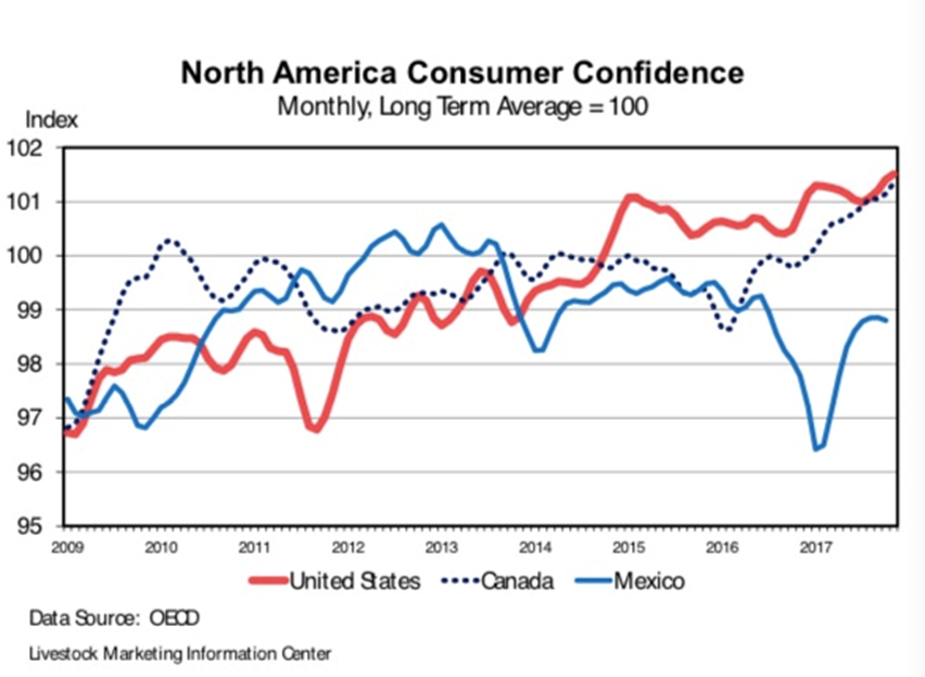 第二張圖表顯示了北美(美國(guó),加拿大和墨西哥)的消費(fèi)者信心指數(shù)。自2015年以來,美國(guó)的消費(fèi)者信心指數(shù)一直處于高位,2017年年中出現(xiàn)一點(diǎn)回撤,年底顯示消費(fèi)信心再次增強(qiáng)。自2016以來,加拿大消費(fèi)者信心指數(shù)穩(wěn)步上升。近幾個(gè)月來,該指數(shù)與美國(guó)并駕齊驅(qū)。墨西哥消費(fèi)者信心指數(shù)于2016開始急劇下降,該指數(shù)已有所回升,但仍低于99(100是長(zhǎng)期平均水平)。