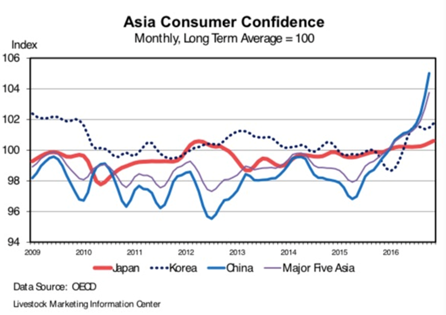 第三張圖表是亞洲消費(fèi)者信心指數(shù)的總結(jié)??傮w上而言,亞洲消費(fèi)者信心在2017年急速上升,中國(guó)最為迅速。南韓也高于100的指數(shù)水平。日本的消費(fèi)者信心緩慢的接近100。此處,主要的五個(gè)亞洲國(guó)家數(shù)值是中國(guó),日本,印度尼西亞和南韓的綜合指數(shù)。