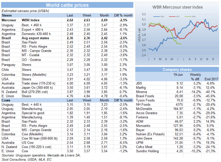 阿根廷微妙的經(jīng)濟(jì)形勢(shì)影響到了比索,也使南方共同市場(chǎng)閹牛指數(shù)承受壓力,阿根廷本地牛價(jià)小幅上漲,但是比索貶值6%,使得美金價(jià)格下跌了13美分到2.43美金/公斤,比索在上周末達(dá)到谷底之后略有回升,顯示貨幣開(kāi)始維穩(wěn)的跡象。巴西育肥牛價(jià)格上漲0.5%,但被雷亞爾的疲軟給抵消掉了,美金牛價(jià)保持在2.36。巴拉圭價(jià)格重新開(kāi)始上漲趨勢(shì),烏拉圭本周牛價(jià)保持不變。南方共同市場(chǎng)閹牛指數(shù)降低了1美分到2.62美金/公斤。