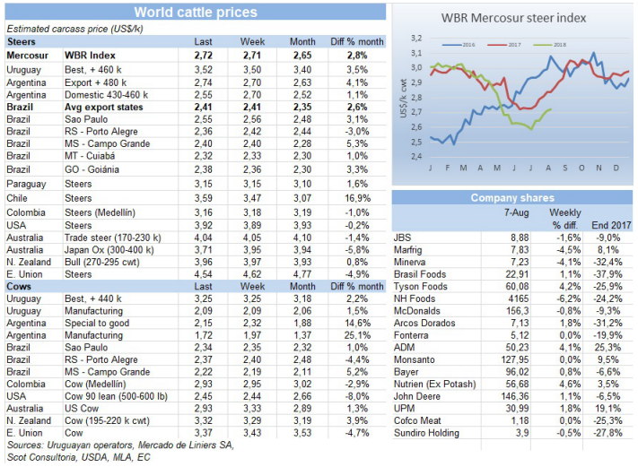 阿根廷閹牛價格再度上漲,自五月初以來阿根廷比索結算價增加了18%,美金價格也從去年十一月最低的2.43漲到2.74美金,漲幅13%,本周貨幣保持穩(wěn)定,本地牛價上漲使美金價格增加了4美分。烏拉圭牛價穩(wěn)中有升,本周3.52美金,近三年最高。巴西本地牛價有所上漲,但美金價穩(wěn)定在2.41美金,巴拉圭牛價也保持不變。本周南方共同市場閹牛指數(shù)漲了1美分至2.72美金。