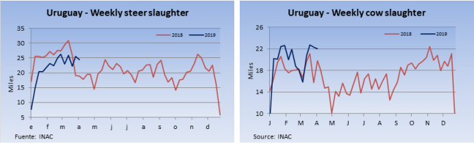 上漲的主要是面向國(guó)內(nèi)市場(chǎng)的待宰牛,小牛犢和小閹牛價(jià)格自年初以來(lái)漲了40%,最近由于價(jià)格回調(diào),總漲幅應(yīng)該在35%左右,年初預(yù)計(jì)出口活牛價(jià)格會(huì)上漲15%,但目前也已經(jīng)遠(yuǎn)遠(yuǎn)超過(guò)這個(gè)漲幅。雖然屠宰量還是很高,但從結(jié)構(gòu)來(lái)看屠宰增加的主要是母牛,二月屠宰量同比增加29%,而小牛犢和閹牛屠宰量減少了15%。面向本地市場(chǎng)的小牛犢和閹牛供應(yīng)短缺,主要因?yàn)轱曈龍?chǎng)利潤(rùn)率不足而進(jìn)行存欄清盤,同時(shí)夏季良好的飼草情況也使活牛生產(chǎn)商可以等待合理的時(shí)機(jī)出售。