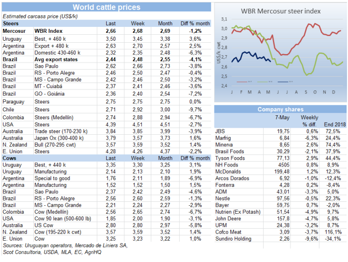 中美貿(mào)易戰(zhàn)升級(jí)影響了南美各國(guó)貨幣匯率,拉低了美金牛價(jià),本周南方共同市場(chǎng)閹牛指數(shù)跌了2美分到2.66美金/公斤,在特朗普發(fā)推威脅加征關(guān)稅之后,阿根廷比索和巴西雷亞爾都有貶值,比索貶值4.2%,雷亞爾貶值1.6%,因此巴西育肥牛跌了4美分到2.44美金,阿根廷閹牛跌了7美分到2.63美金,烏拉圭活牛進(jìn)一步短缺,價(jià)格再度上漲,達(dá)到3.5美金,巴拉圭牛價(jià)連續(xù)三周不變,保持在2.75美金。