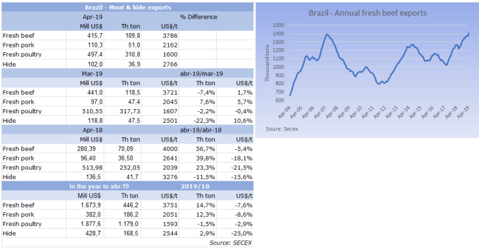 截止到四月的12個(gè)月內(nèi),巴西共出口141萬(wàn)噸牛肉,創(chuàng)下了12年前2007年五月創(chuàng)下的139萬(wàn)噸的記錄。四月巴西出口了109804噸牛肉,均價(jià)3786美金離岸價(jià),雖然量比三月底,但遠(yuǎn)超去年四月,去年五六月由于運(yùn)輸罷工,出口量很低,所以今年五六月份有望繼續(xù)突破連續(xù)12個(gè)月的出口量記錄。目前巴西已經(jīng)連續(xù)十個(gè)月出口量超過(guò)10萬(wàn)噸。