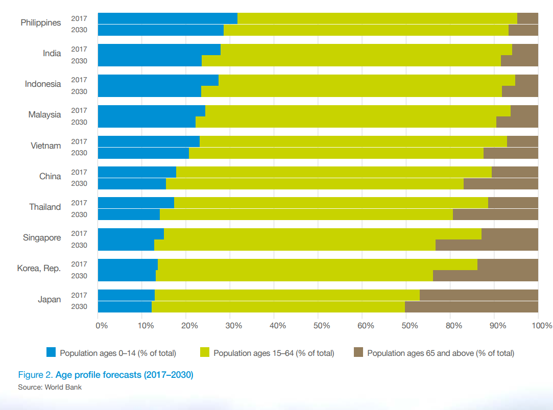 另一個影響亞洲的是明顯的人口結構變化。到2050年亞太地區(qū)超過25%的人口是60歲以上,較2016年數(shù)量翻番。韓國和日本已經(jīng)是老齡化國家,中國開始出現(xiàn)老齡化問題。(圖二:2017-2030年年齡結構預測)