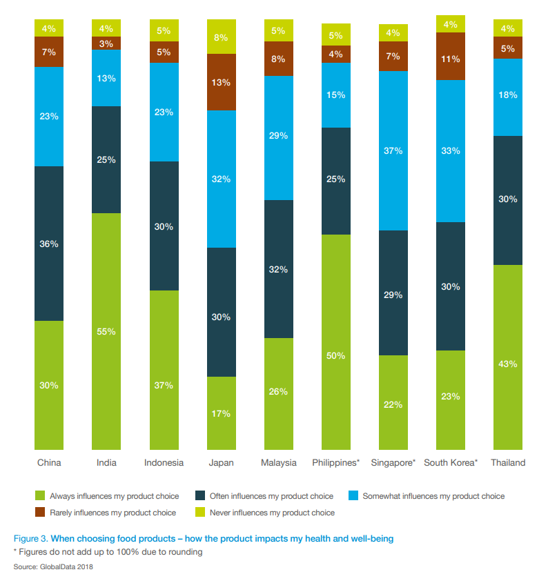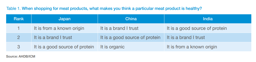 隨著生活水平和受教育程度提高,亞洲消費者越來越關心健康問題。與此同時,飲食結構引發(fā)的慢性病越來越多,消費者更加注重食品對于健康的影響。超半數(shù)亞洲受訪者認為食品對健康的影響是選擇購買時的考慮因素。中國和越南將食品安全作為消費首要考慮因素。不到1/3的中國消費者和25%的日本消費者認為瘦肉更健康。中國和日本消費者對肥肉并不抗拒。但是,在日本女性消費者認為羊肉更健康。(圖三:選購食品——食品如何影響健康和福祉)(表一:選購肉類產(chǎn)品,哪種肉制品,你認為是健康的)