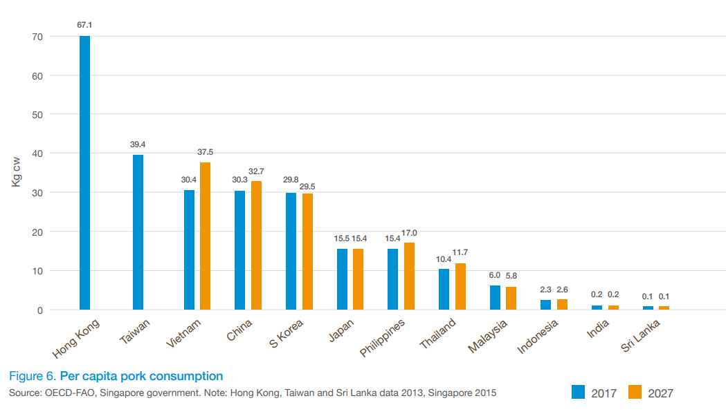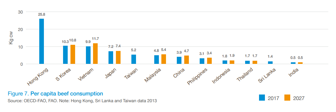 到2027年預計越南豬肉和牛肉消費增長幅度最大,中國羊肉消費增長幅度最大。(圖六-八:豬肉/牛肉/羊肉人均消費量)