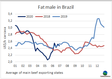 上周巴西主要牛產(chǎn)區(qū)育成牛價格強(qiáng)勁上漲,圣保羅州上周五活牛價格指數(shù)達(dá)218.35雷亞爾/15公斤,較前一周成交價上漲8雷亞爾/15公斤。本周價格增長最明顯的地區(qū)戈亞尼亞(上漲10雷亞爾至207雷亞爾/15公斤),圣保羅(上漲了9.5雷亞爾,上漲至216.5雷亞爾/15公斤)30天內(nèi)付款。圣保羅做出口業(yè)務(wù)的工廠出價高達(dá)220雷亞爾/15公斤。那些做國內(nèi)屠宰的工廠出價低5-10雷亞爾/15公斤。供需雙方都比較樂觀,由于價格預(yù)計將繼續(xù)上漲,牛只供應(yīng)不足,牧草條件依然良好,生產(chǎn)者可以壓欄,價格預(yù)期繼續(xù)上漲。期貨預(yù)訂時間很短,從4天到5天不等。從需求端看,庫存很低,而且接近月初,人們預(yù)計銷售情況會好轉(zhuǎn)。此外,7月6日起圣保羅酒吧和餐館的可能重新開放,也為市場帶來積極的氣氛。