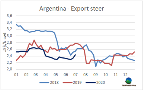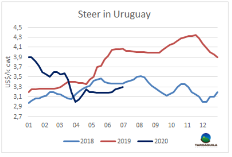 本周南方共同市場閹牛平均價格覆蓋了巴西貨幣疲軟帶來的價格下行。受疫情擴(kuò)散帶來的擔(dān)憂影響,巴西貨幣兌美元匯率下跌6.1%。盡管巴西育成牛平均價格上漲8雷亞爾/15公斤,上漲至202.8雷亞爾/15公斤,其美元價格下跌了5美分,下跌至2.47美元/公斤。南美地區(qū)其他國家育成牛價格均上行,尤其在阿根廷,活牛供應(yīng)短缺以及冰鮮產(chǎn)品到歐洲的出口價格拉動出口閹牛價格上漲10比索/公斤。美元價格達(dá)到2.35美元/公斤。烏拉圭方面供應(yīng)短缺導(dǎo)致活牛參考價上漲3美分,上漲至3.3美元/公斤。WBR南方市場閹牛價格指數(shù)上漲1美分,至2.6美元/公斤。
