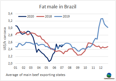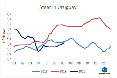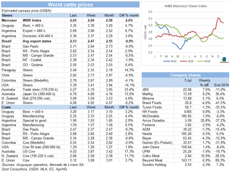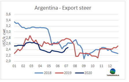 南方共同市場四國待宰牛平均價(jià)格連續(xù)第二周上漲。南方市場閹牛價(jià)格指數(shù)上漲了5美分,上漲至2.65美元/公斤,達(dá)三月中旬疫情在南美爆發(fā)以來最高。漲幅在3-6美分,受當(dāng)?shù)乩讈啝杻r(jià)格上漲拉動(dòng),盡管匯率漲了1.5%,巴西主要出口州育成牛價(jià)格上漲6美分,上漲至2.53美元/公斤。烏拉圭和巴拉圭牛價(jià)上漲5美分,烏拉圭牛價(jià)在南美地區(qū)最高,達(dá)3.3美元/公斤。巴拉圭牛價(jià)是南美地區(qū)最低,2.4美元/噸。阿根廷出口閹牛價(jià)格上漲3美分,上漲至2.69美元/公斤胴體價(jià),包含9%的牛肉出口稅。