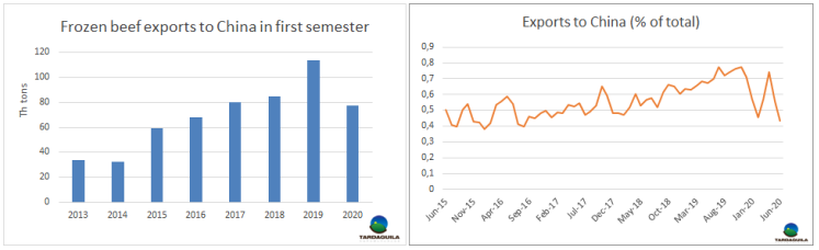 上一季度冰鮮牛肉出口量較冷凍牛肉出口量下降幅度更大,歐洲、巴西、智利等冰鮮牛肉的傳統(tǒng)市場受新冠疫情影響,需求大幅下降。4-6月,烏拉圭冰鮮牛肉出口量6053噸,同比減少36%,冷凍牛肉出口量64420噸,同比減少18%。烏拉圭出口商正在尋找其他替代市場。在過去的一個(gè)季度,到北美和亞洲的出口量顯著增加。出口至北美市場898噸,是2019年同期338噸的兩倍多。到亞洲出口量增加了近150%,達(dá)814噸,其中出口至日本566噸,出口至中國248噸。過去兩個(gè)月,冰鮮牛肉到中國出口量已經(jīng)從很少增長至每月5柜。本季度出口到中國的冰鮮牛肉平均價(jià)格5685美元/噸,而冷凍牛肉平均價(jià)格為4561美元/噸。