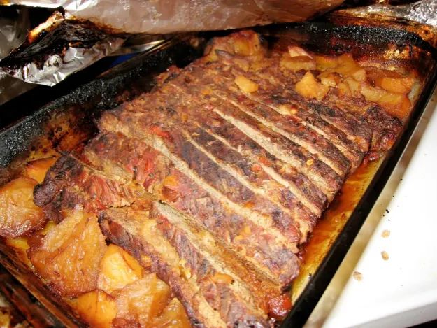 那具體怎么烹制呢?首先剔除多余的脂肪,然后用口急汁、鹽、黑胡椒碎、牛至葉等均勻涂抹于牛前胸肉,然后用錫紙包裹起來進(jìn)行腌制一夜,烤制前還可用針管注入由牛肉湯、黃油、醬油等調(diào)的醬汁,然后放在炭火上,加果木,以120℃-125℃烤,熏烤期間可噴適量蘋果醋,熏烤八九個小時后,取出前胸肉,用錫紙包裹好再放入烤爐中。包裹錫紙一是為了減少牛前胸肉內(nèi)部水分流失,二是使熱量集中,節(jié)省烤制時間。