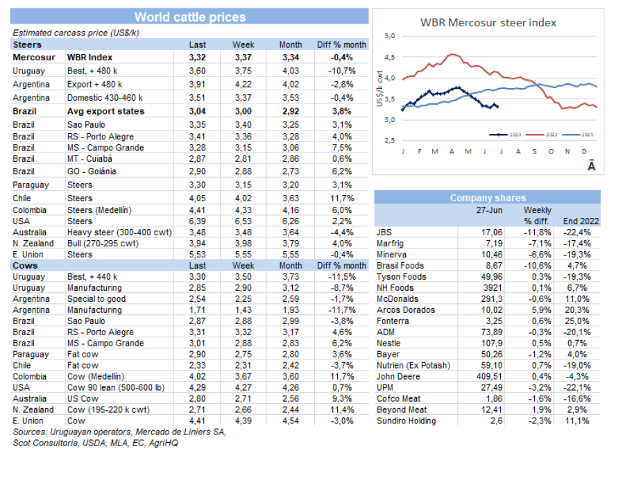 卡內(nèi)洛內(nèi)斯與科洛尼亞和伊納勒這兩個(gè)工廠一樣,是馬弗里格在該國南部(那里的干旱情況更嚴(yán)重)的不活動(dòng)工廠??坡迥醽喴呀?jīng)有五個(gè)星期沒有活動(dòng)了,仍然沒有恢復(fù)的日期;伊納勒上周加入了。原則上,這兩個(gè)Marfrig工廠將在7月下半月恢復(fù)活動(dòng)。