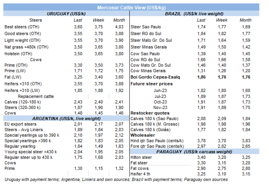 隨著阿根廷和烏拉圭的公牛價(jià)格下降,巴西和巴拉圭的公牛價(jià)格上升,該地區(qū)牛的屠宰價(jià)格差距縮小了。