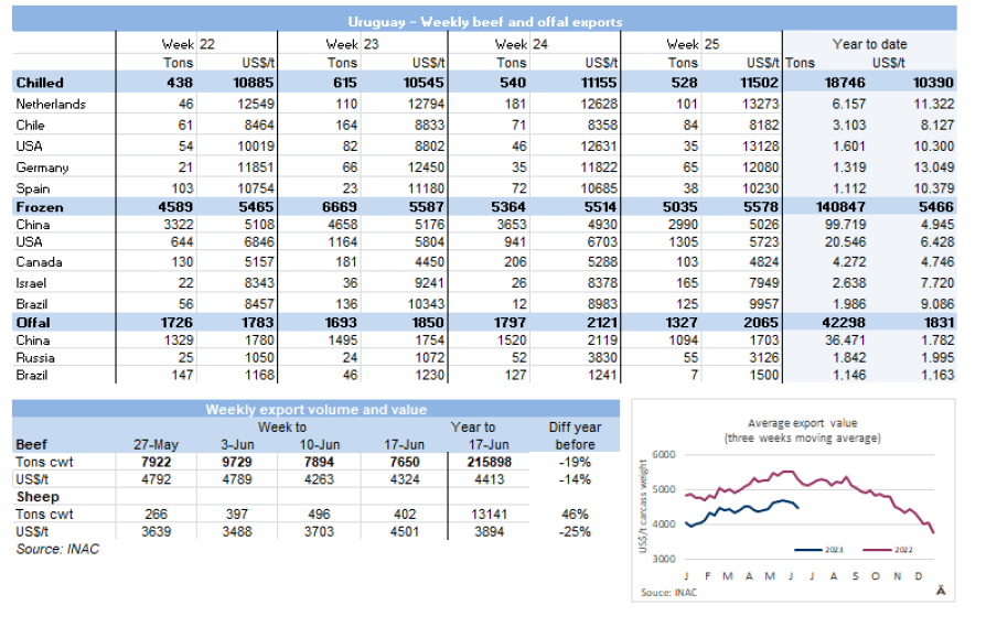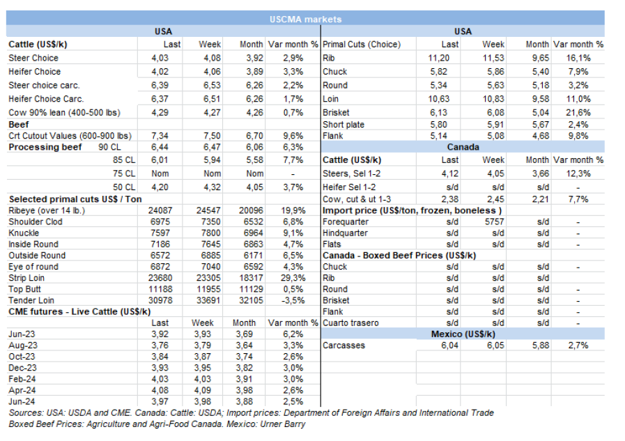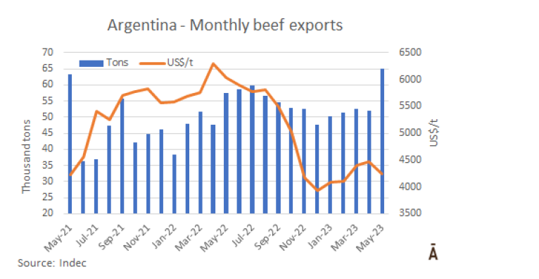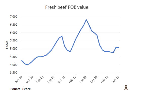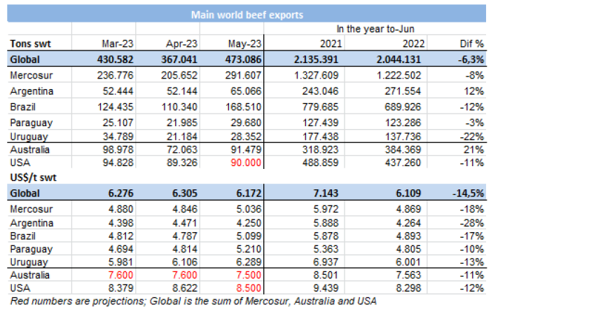 5月份出口的金額為2.765億美元,比上個(gè)月增加16.4%,比2022年5月減少20.4%。牛肉的均價(jià)為每噸$4250,月度同比下降4.9%,年度同比下降29.6%。