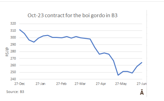 南馬托格羅索州和馬托格羅索州的上調(diào)幅度比較大,分別為R$10和R$5。在期貨市場(chǎng),10月23日boi gordo合約在經(jīng)歷了4月初和5月下半月的大幅下跌后正在恢復(fù),當(dāng)時(shí)它從R$300下跌到R$250(-18%)。從那時(shí)起,它已經(jīng)恢復(fù)了約R$18。達(dá)到R$264。與圣保羅價(jià)格相比,該合同的溢價(jià)超過R$20。