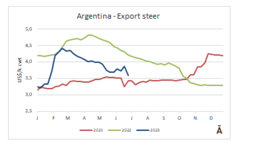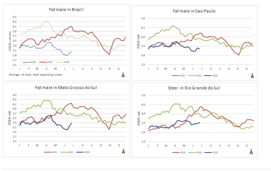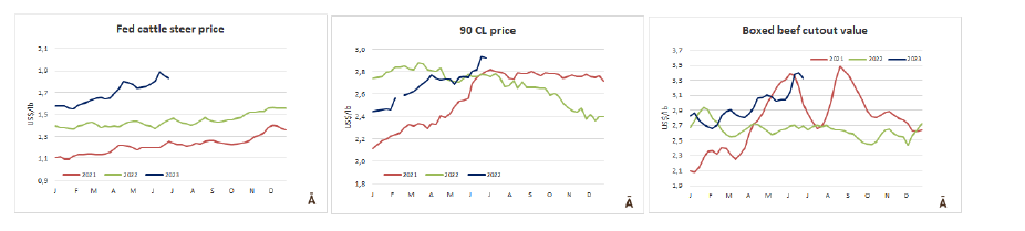在過去的兩個(gè)月里,肥牛價(jià)格再次下跌。出口肥牛參考價(jià)格從4月底的$4.30/公斤下降到本周的$3.73/公斤,下降了13%。同時(shí),小牛的價(jià)格從$2.51/公斤降至$2.43/公斤,僅損失3%。
