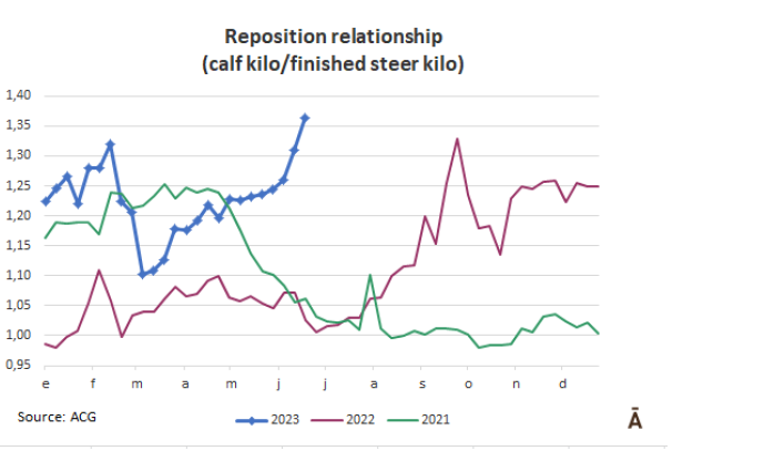 在2021年7月-2022年6月期間,由于歷史上成品牛價(jià)格高,替代率非常接近1比1的水平。去年下半年開始,這種情況開始改變,當(dāng)時(shí)屠宰用動(dòng)物的價(jià)格出現(xiàn)了強(qiáng)烈的調(diào)整,而這種調(diào)整并沒有完全轉(zhuǎn)移到其他類別。