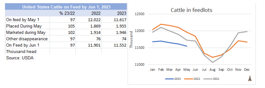 2023年6月1日,產(chǎn)能在1000頭以上的飼育場(chǎng)中的牛群總數(shù)為1160萬頭,比去年同期下降3%。5月份的投放量為196萬頭,比2022年高出5%。市場(chǎng)銷售總量為195萬頭,比去年高2%。