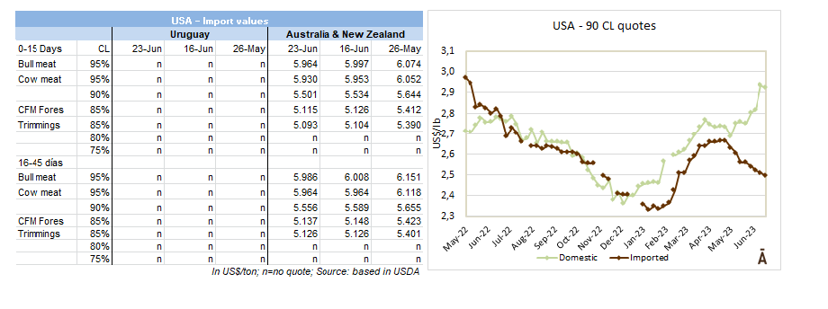 在7月4日的獨(dú)立日假期之前,本周美國進(jìn)口市場(chǎng)略顯平靜。澳大利亞大量出口肉類,占據(jù)市場(chǎng)主導(dǎo)地位。配額外的90牛前參考價(jià)格為$4000(CFR),95牛前的參考價(jià)格為$4200。