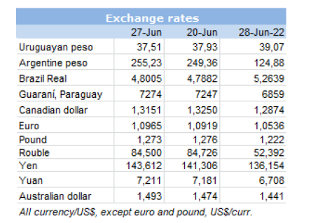 無論如何,阿根廷仍是該地區(qū)價(jià)格最高的國家,其次是烏拉圭,其價(jià)格趨勢(shì)也是向下的。本周的出口價(jià)格下降了15美分,為$3.60/公斤。