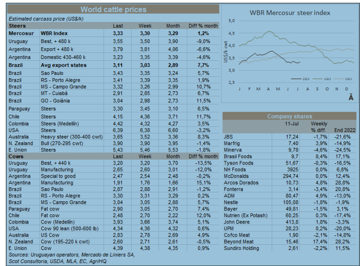主要受到巴西升值的支持,本周WBR Mercosur 閹牛指數(shù)上升3美分,至每公斤3.33 美元。