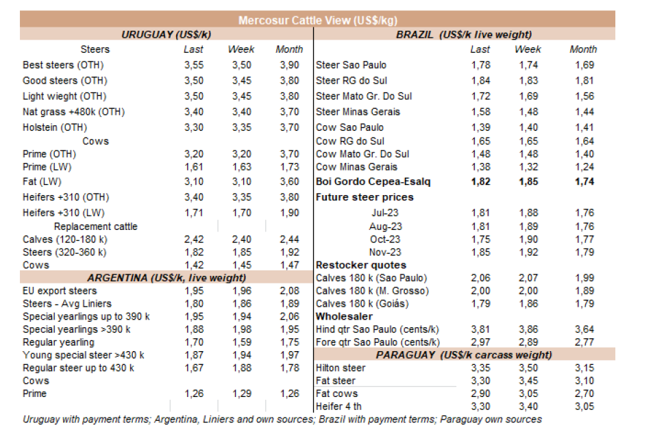 在國際市場穩(wěn)定的支持下,極低的供應(yīng)和比較大的購買興趣使市場更加穩(wěn)定。此外,Marfrig-Colonia 恢復(fù)了工作,因此只剩下Marfrig-Inaler and Minerva-Canelones兩家公司沒有交易。