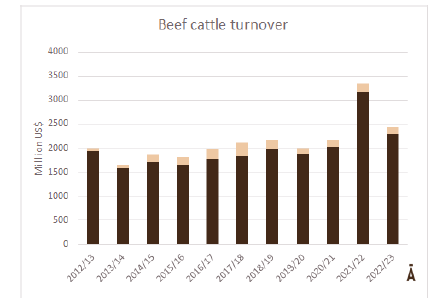 2022/2023財(cái)年,牛的最終銷售額約(包括屠宰和活牛)24.5億美元,年降幅為9億美元(-27%),當(dāng)時(shí)開具了33.4億美元的發(fā)票。銷售量和平均銷售價(jià)格下降導(dǎo)致了牛營業(yè)額的下降。