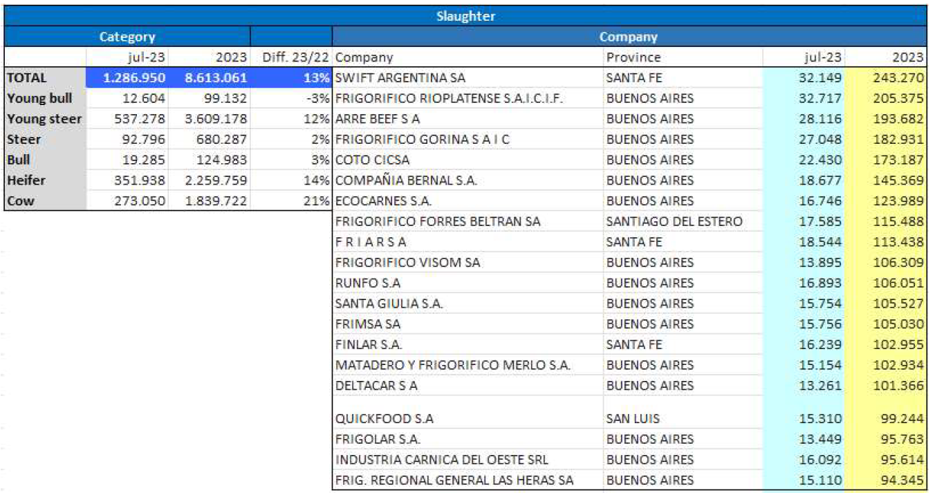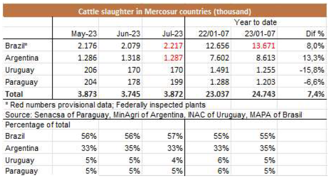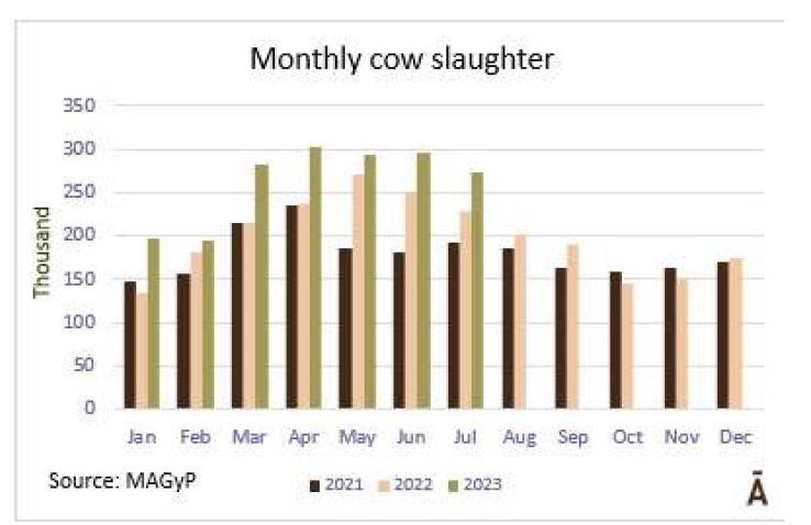 7月份,共屠宰129萬頭牛,比上月減少2%,比去年同月增加16%.根據(jù)官方數(shù)據(jù)。在今年的前7個(gè)月,861萬頭牛被屠宰,年增長率為13%,這是自2009年大清算以來的最大增幅,該清算使該國的牛存欄減少了20%。與2022年相比,2023年的增長尤其體現(xiàn)在屠宰量增長了21%,然后是小母牛增長了14%,其次是幼牛,年增長了12%。7月份,母牛屠宰量占總數(shù)的48.5%以上。今年到目前為止,這一比例約為47.5%,而2022年同期為46%。