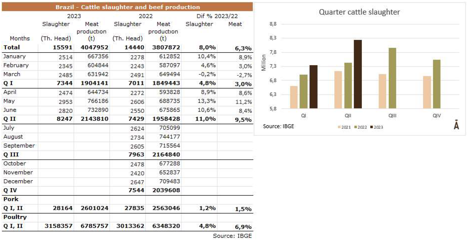 根據(jù)IBGE發(fā)布的畜牧業(yè)生產(chǎn)統(tǒng)計(jì)的初步結(jié)果,2023年第二季度,巴西有825萬頭牛在某種類型的衛(wèi)生檢查下被屠宰。與2022年第二季度相比,這一數(shù)量增長了11%,與2023年第一季度相比增長了12.3%;與前三個(gè)月相比,增加了90.3萬頭。2023年第二季度214萬噸牛肉胴體的產(chǎn)量,意味著與上年同期相比增長9.5%,與2023年第一季度相比增長12.6%。由于屠宰量的增加是由于被送往屠宰場的雌性數(shù)量增加,因此酮體的重量往往會(huì)減少。該季度平均體重為260公斤,比2022年同期減少3.7公斤。與此同時(shí),豬肉產(chǎn)量總計(jì)130萬噸,同比下降0.3%,而家禽產(chǎn)量增加330萬噸,同比增長7.2%。