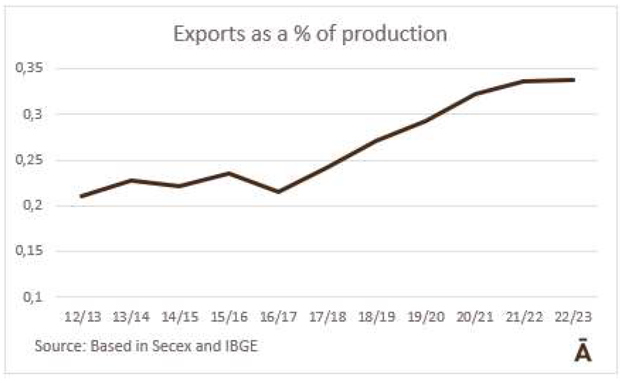 2022/23年,巴西生產(chǎn)了825萬噸牛肉胴體,與上一財(cái)年相比增長了8%(60.7萬噸)。反過來,牛肉出口總量為278萬噸胴體,按百分比計(jì)算,增幅略高于產(chǎn)量(21.6萬噸)。因此,巴西國內(nèi)牛肉消費(fèi)量也增長了8%,估計(jì)為547萬噸,比2021/22年增加了39.1萬噸。巴西停止了2016/17年開始的牛肉出口比例增長趨勢。在7月1日開始的2023/24財(cái)政年度,考慮到國際需求的疲軟和屠宰牛價(jià)格的下降,出口牛肉的比例將有所下降,這對(duì)巴西人來說是可行的。在7月1日開始的2023/24財(cái)政年度,考慮到國際需求的疲軟和屠宰牛價(jià)格的下降,出口牛肉的比例將有所下降。