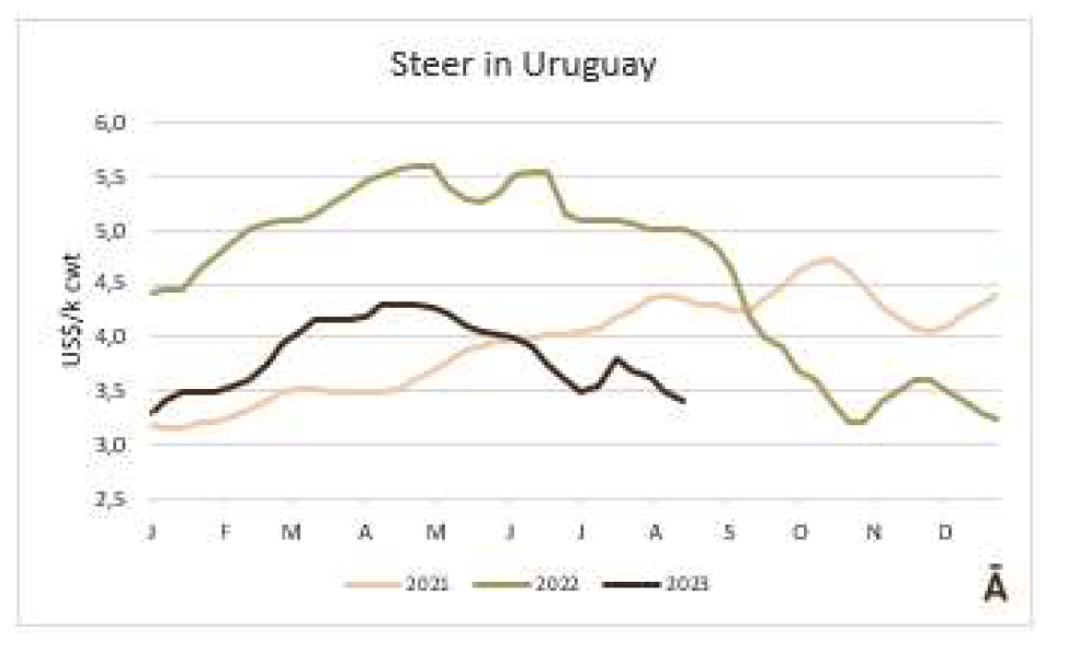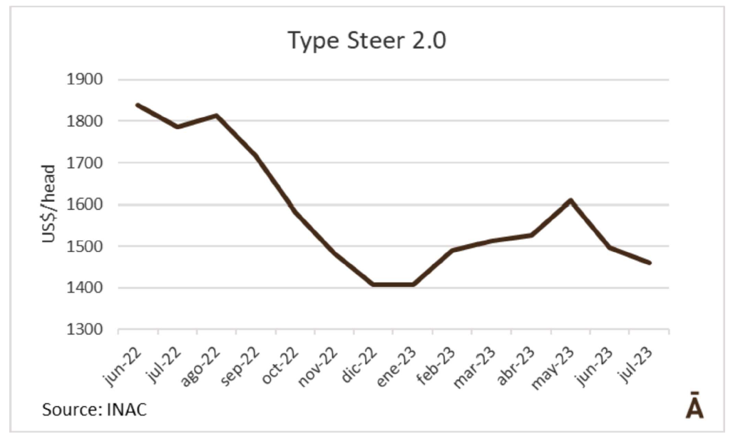 INAC 閹牛類型價(jià)值2.0在6月份跌了100美元以上后,7月份每頭又下跌36美元至1461美元。INAC閹牛類型價(jià)值預(yù)計(jì)了銷售烏拉圭特質(zhì)公牛所有產(chǎn)品中獲得的收入,并按比例考慮了在國外和當(dāng)?shù)厥袌龅牟季?。由于出口和國?nèi)市場胴體價(jià)格下跌導(dǎo)致閹牛類型價(jià)值下降。另一方面,內(nèi)臟和副產(chǎn)品的價(jià)值以及生皮的價(jià)格也保持穩(wěn)定。7月份,公牛的價(jià)格下降了5.1%(61美元)至1133美元/頭。另一方面,工業(yè)增加值在月度比較中每頭回升25美元(+8.3%)。