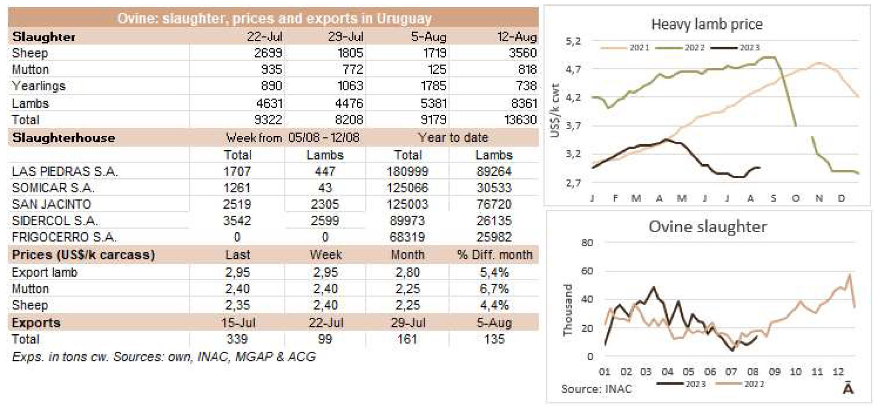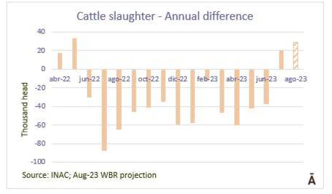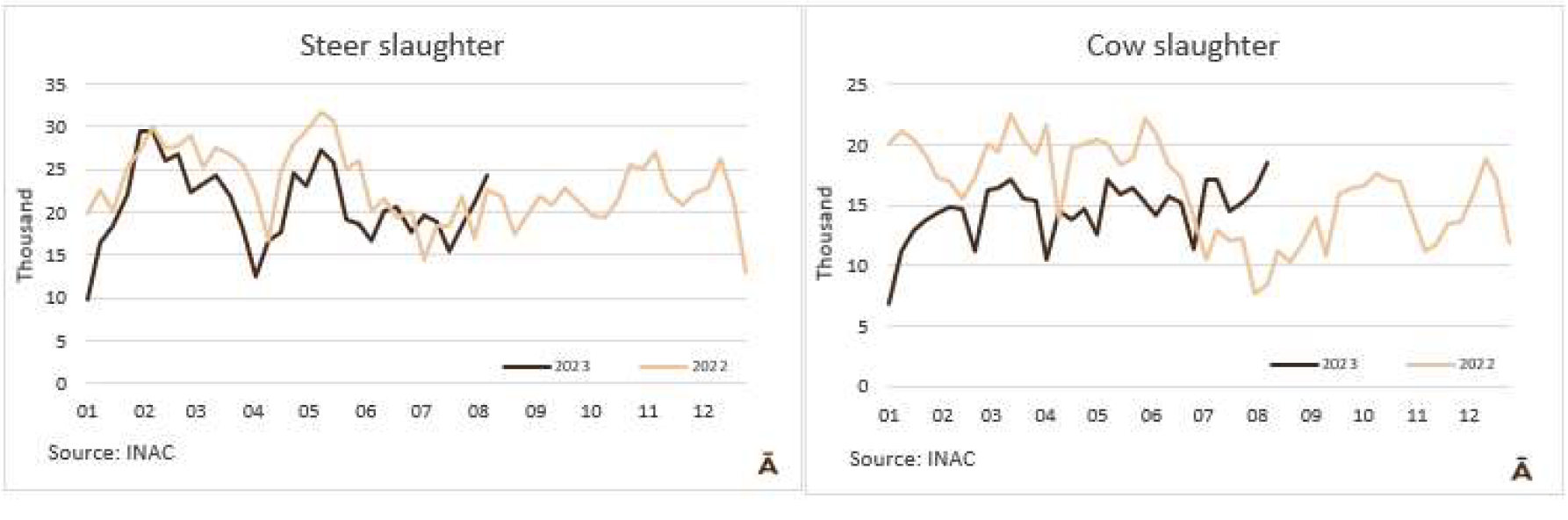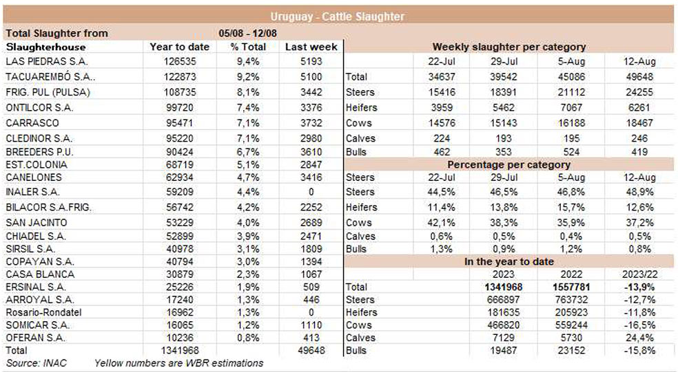上周的牛屠宰量接近5萬頭,是自5月第二周以來數(shù)量最多的一周,當(dāng)時(shí)屠宰場也在積極為481配額窗口工作。INAC報(bào)告稱,在截至8月12日的一周內(nèi),有49648頭牛進(jìn)入工廠,比前一周增加了10%,比去年同期的37000頭增加了33%。屠宰量最大是Las Piedras(5193)、Marfrig-Tacuaremb6(5100)和Minerva Carrasco(3732)。擁有三個(gè)工廠的Marfrig屠宰了10927頭牛(周比較為-255頭),而同樣擁有三個(gè)工廠的Minerva屠宰了10590頭牛(周增加3552頭)。Marfrig lnaler本周再次開始恢復(fù)生產(chǎn),而Cledinor下周將進(jìn)入許可期。就Minerva而言,從下周開始,它將進(jìn)入卡拉斯科工廠的許可期。截至8月,共有86907頭牛被屠宰,比去年同期多36%。事實(shí)上,牛的屠宰量將連續(xù)第二個(gè)月高于2022年。