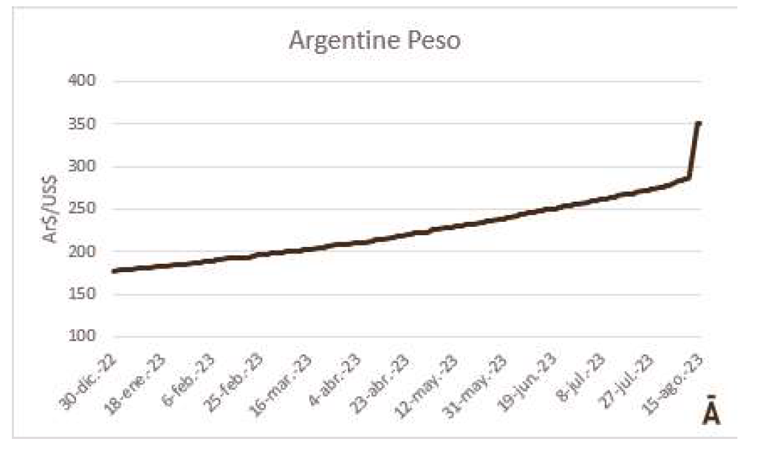 周日的選舉結(jié)果顯示,得票最多的候選人是哈維爾·米利,他是一位經(jīng)濟(jì)學(xué)家,在2021年之 前沒有政治生涯,提出了極端自由主義的建議。周日,被稱為“加密貨幣”的金融美元上漲了約10%。周一,根據(jù)國際貨幣基金組織發(fā)放資金的要求,政府將阿根廷比索貶值22%,以縮小其與自由美元之間超過100%的匯率差距。然而,隨著非官方匯率升至700比索以上,這一差距立即再次擴(kuò)大。所有這些不確定性,在一個(gè)更加微妙的情況下,導(dǎo)致所有行業(yè)的銷售額普遍下降。昨天,政府與超市和食品公司召開緊急會(huì)議,試圖阻止價(jià)格上漲。