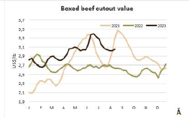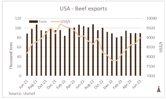 根據(jù)外貿(mào)部的數(shù)據(jù),8月第二周,巴西以每噸4482的平均價(jià)格出口了42077噸牛肉。平均價(jià)格為4500美元/噸,比6月第一周的平均價(jià)格每噸低600美元(-13%)。在8月的前9個(gè)工作日,巴西以每噸4507的平均價(jià)格出口了83344噸牛肉。預(yù)計(jì)月底的產(chǎn)量將略低于20萬噸,這意味著與2022年8月的20.3萬噸相比將略有下降。