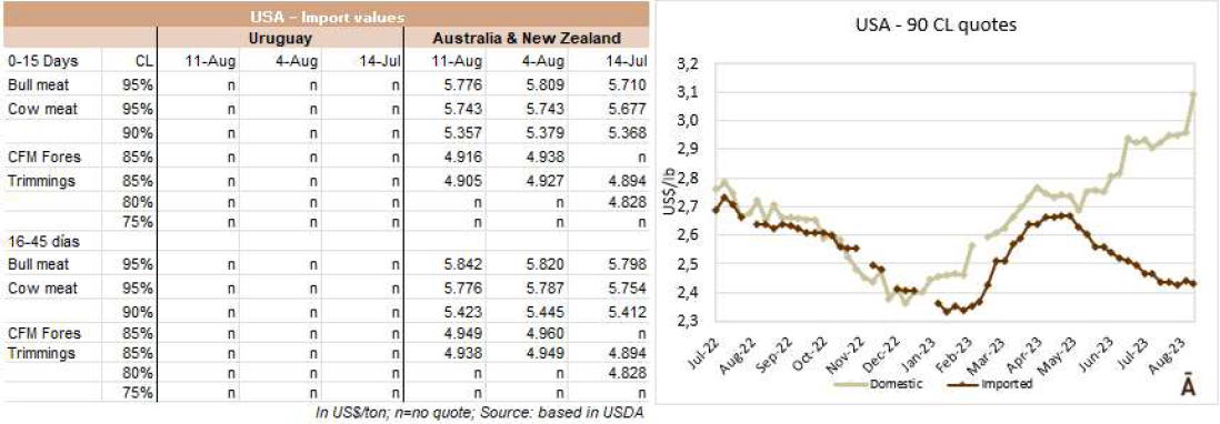 上周,美國進(jìn)口市場價(jià)格沒有發(fā)生大的變化。根據(jù)一位貿(mào)易商的說法,配額范圍內(nèi)的烏拉圭90CL牛前,參考價(jià)格仍在CFR 4550美元左右。智利牛肉市場的大型零售企業(yè)正爭分奪秒地試圖淘汰9月初到期的牛肉。據(jù)消息人士透露,巴西和巴拉圭的19分體價(jià)格為CIF 5300美元至5400美元之間。另一方面這兩個(gè)供應(yīng)商第一季度的牛前價(jià)格分別為4900-5000美元。