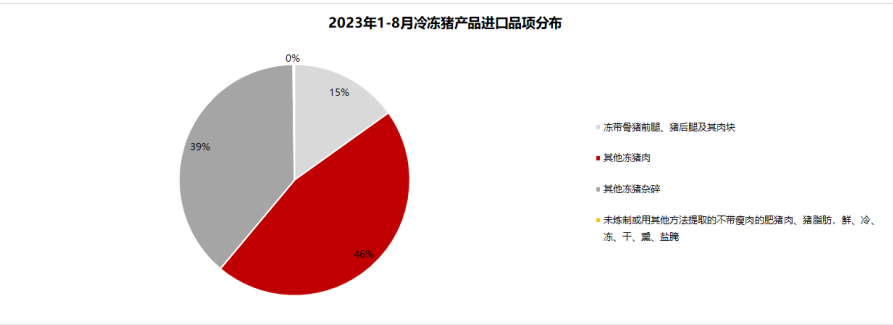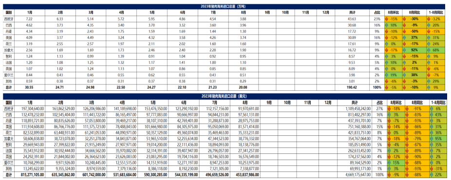 2023 年 8 月中國主港豬肉進口量 20.08 萬噸,環(huán)比減少 5%,同比減少 10%。1-8 月主 港豬肉進口量 190.42 萬噸,同比增加 9%。從進口國別看,其中,從西班牙進口豬肉共計 43.63 萬噸,同比減少 3.2%,占比 23%。從美國進口豬肉共計 30.89 萬噸,同比增加 31%,占比 16%。從巴西進口豬肉共計 30.68 萬噸,同比增加 20%,占比 16%。從丹麥進口豬肉共計 17.72 萬噸,同比減少 15%。值得關(guān)注的是,8 月巴西豬肉進口量 3.96 萬噸,環(huán)比增加 10%, 同比減少 9%,首月超過從西班牙進口豬肉數(shù)量(3.88 萬噸),排名第一。從進口品項看,1-8 月,凍帶骨豬前腿、豬后腿及其肉塊進口量 28.81 萬噸,占比 15%。其他凍豬肉進口量 87.51 萬噸,占比 46%。其他凍豬雜碎 73.70 萬噸,占比 39%。豬油脂類進口量僅 0.37 萬噸。從 進口金額看,1-8 月,主港豬肉進口總額 46.69 億美金,同比上漲 22%。其中,進口西班牙 豬肉金額 11.09 億美金,同比上漲 6%。進口巴西豬肉金額 8.13 億美金,同比上漲 43%。進 口美國豬肉金額 7.51 億美金,同比上漲 31%。進口丹麥豬肉金額 4.37 億美金,同比上漲 3%。