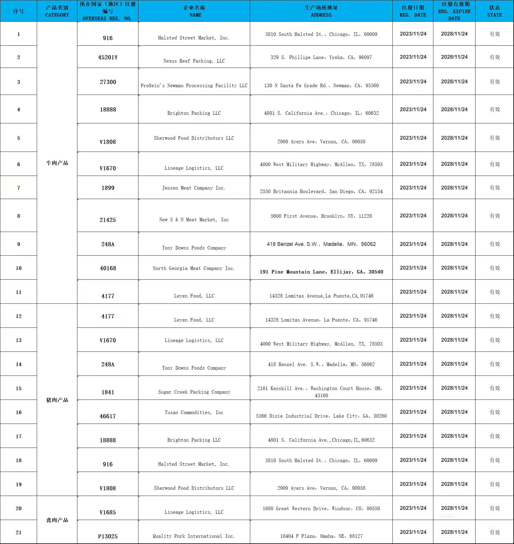 2023年11月24日美國新增21家肉類工廠獲準(zhǔn)輸華!(牛肉11家、豬肉8家、禽肉2家)