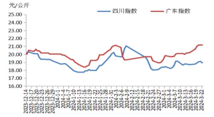 本周,四川豬肉周均價為每公斤18.96元,環(huán)比上漲1.3%,同比上漲2.2%,同比漲幅擴大2.0個百分點。川內(nèi)散養(yǎng)戶出欄積極性不高,適重豬源減少;家庭消費逐漸恢復,豬肉經(jīng)銷商拿貨積極性提升,需求短時小幅增加。供減需增提振四川地區(qū)豬肉周均價環(huán)比小幅上漲。