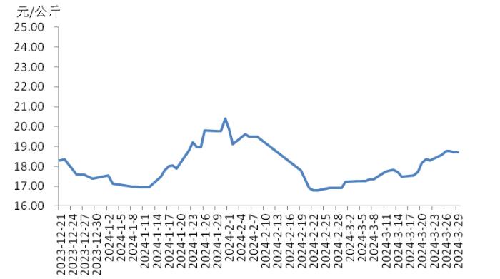 據(jù)農(nóng)業(yè)農(nóng)村部信息中心和山東卓創(chuàng)資訊股份有限公司聯(lián)合監(jiān)測(cè),2024年第13周(即2024年3月25日-3月29日,以下簡(jiǎn)稱本周),16?。ㄖ陛犑校┦萑庑桶讞l豬肉出廠價(jià)格總指數(shù)的周平均值為每公斤20.12元,環(huán)比上漲2.9%,同比上漲6.6%,較上周擴(kuò)大5.3個(gè)百分點(diǎn)。