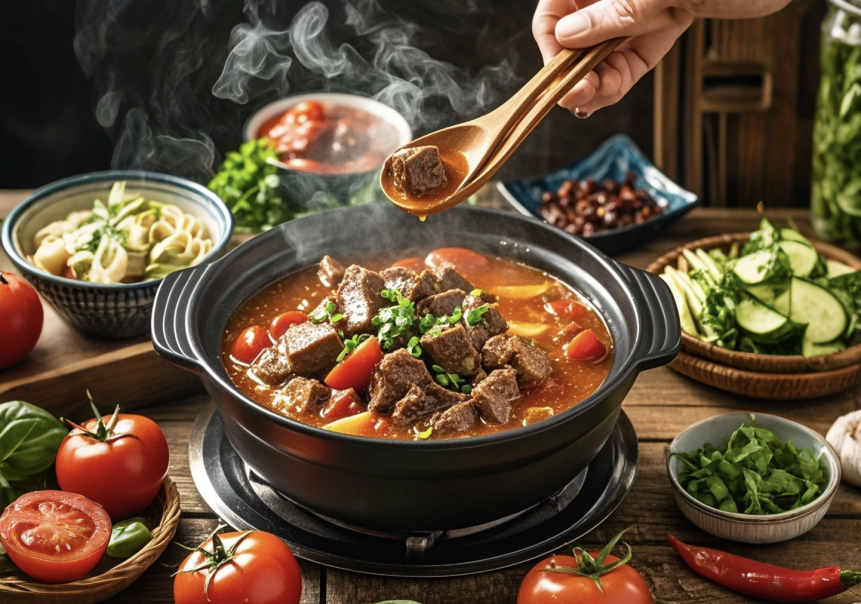 廣式清湯牛腩火鍋以其清淡鮮美而著稱。清澈的湯底,用牛骨和拍姜、香葉、玉竹、陳皮、炒香的胡椒等各種香料熬制而成。牛腩在清湯中煮至軟爛,保留了牛肉的原汁原味,可加入大塊蘿卜。吃的時(shí)候,可以蘸上特制的沙茶醬、海鮮醬或腐乳蘸料等,口感更加豐富。廣式清湯牛腩火鍋?zhàn)⒅厥巢牡男迈r和品質(zhì),通常會搭配上各種海鮮、肉丸、蔬菜等,鮮美溫補(bǔ)。