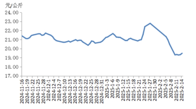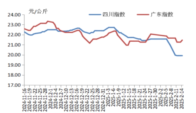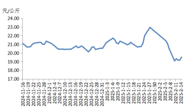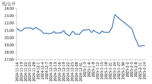 本周華中地區(qū)豬肉價格環(huán)比明顯下跌,周內(nèi)價格先跌后漲。前半周,規(guī)模養(yǎng)殖場的生豬出欄量增加,散養(yǎng)戶將春節(jié)節(jié)前壓欄豬源陸續(xù)釋放,使得生豬及豬肉供應(yīng)充沛,而豬肉消費表現(xiàn)一般,元宵節(jié)提振力度較弱,致使屠宰企業(yè)訂單銷售速度不快,豬肉價格明顯下跌。后半周,各院校開學(xué)后食堂訂單小幅增多,經(jīng)銷商采購積極性增加,帶動豬肉價格有所反彈,幅度有限??傮w看,本周華中地區(qū)豬肉周均價明顯低于上周。